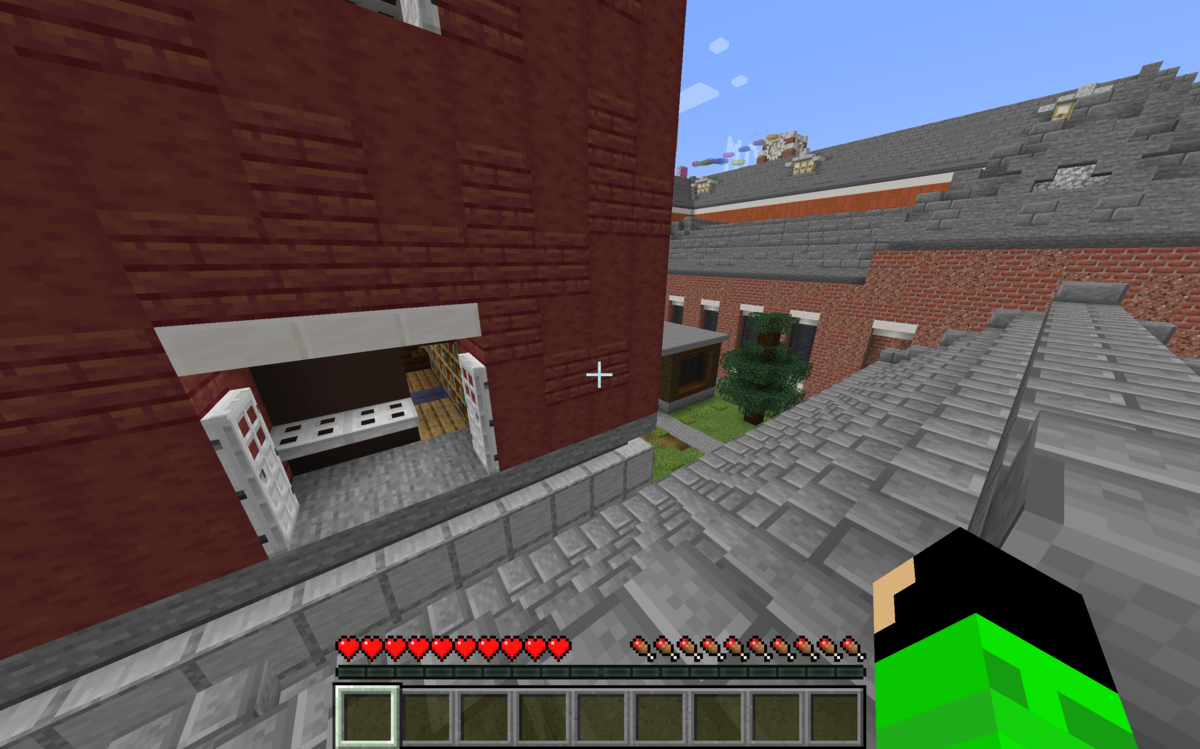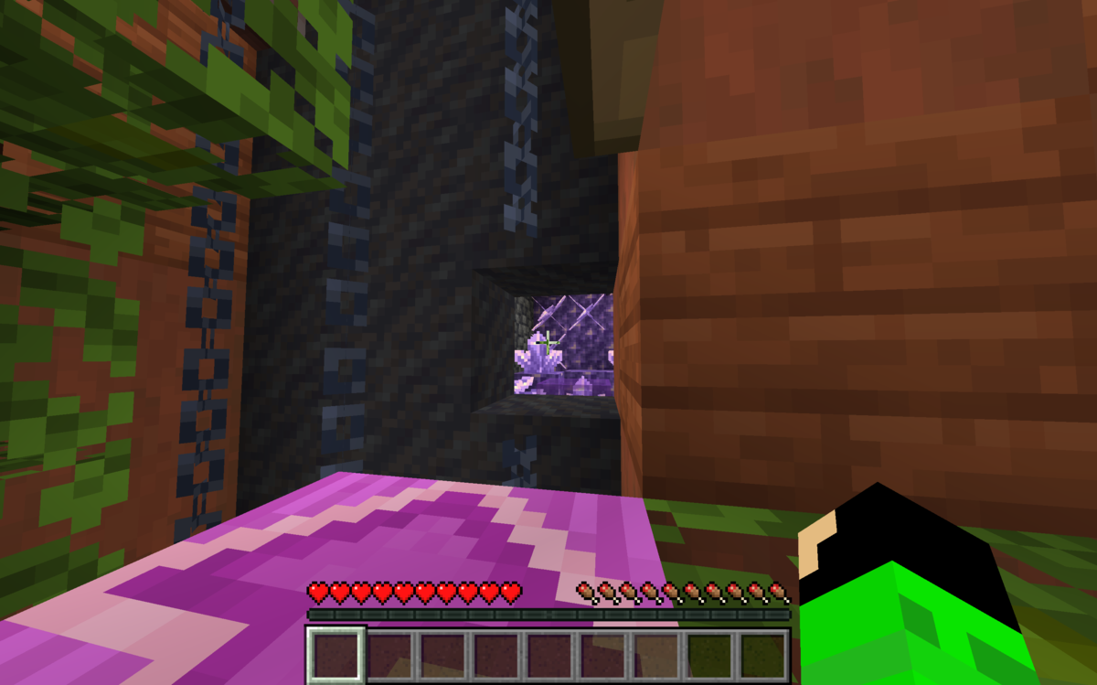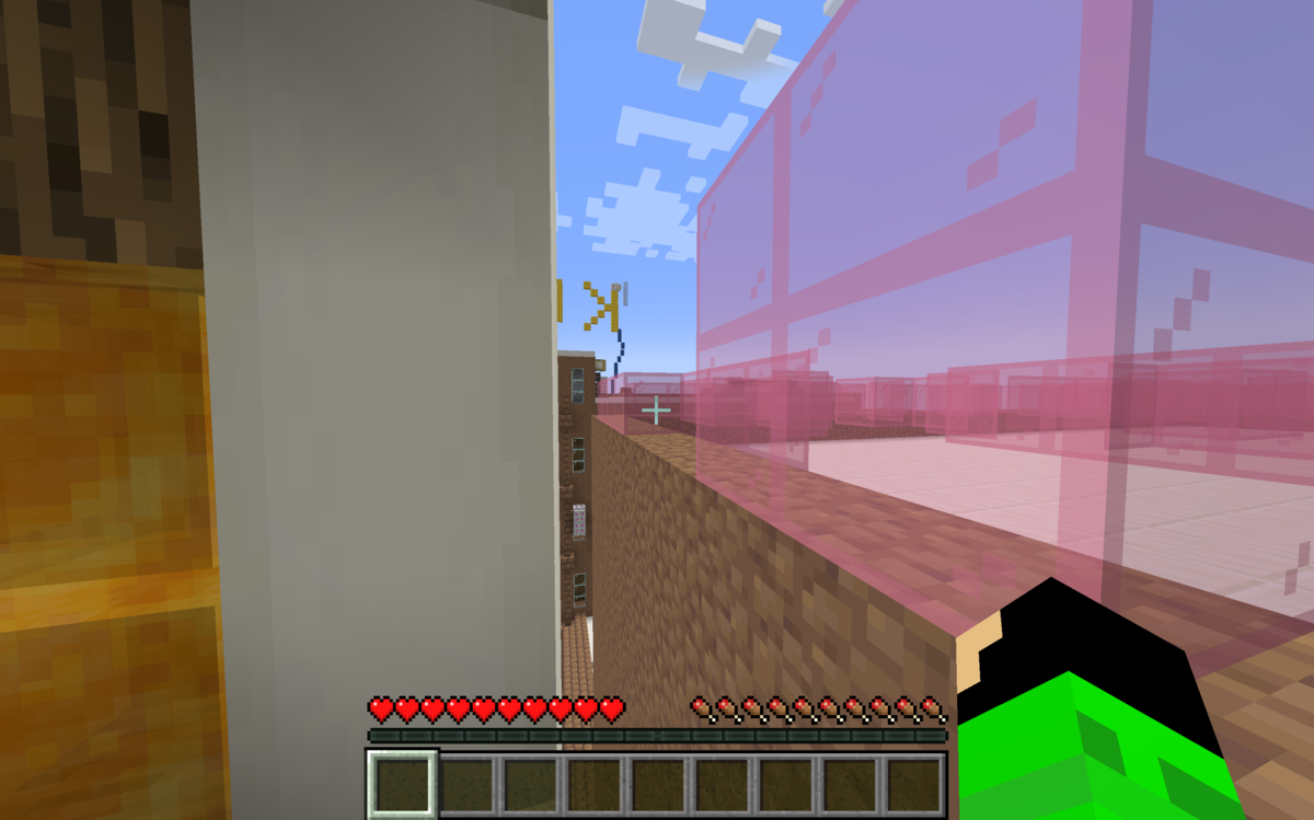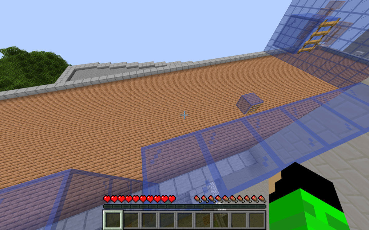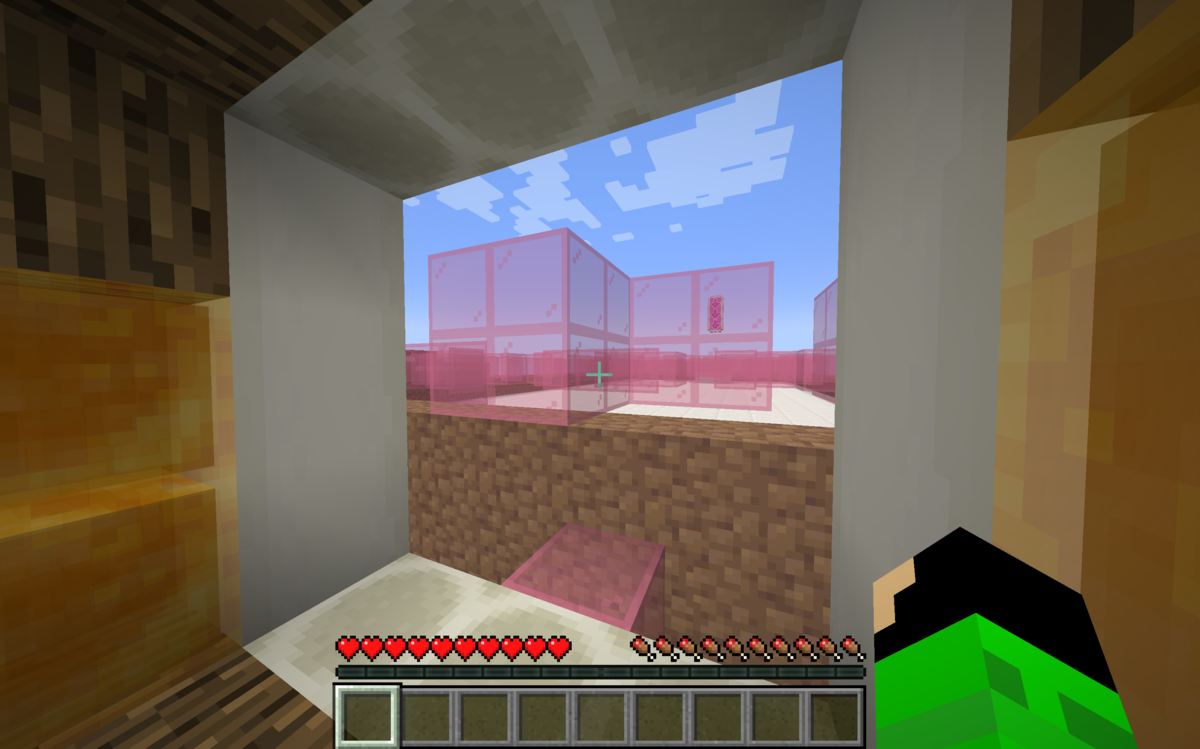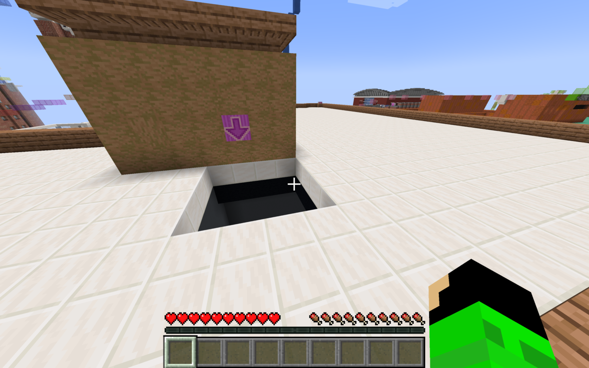 そして、矢印が指し示す先には1マスの穴があるので、木のトラップドアを使ってくぐり抜けます。