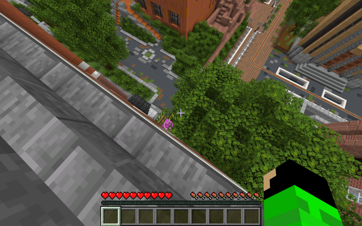 そして、屋根をまっすぐに進むと、黄色のガラスの足場がある付近の木の上に飛び乗ることができます。